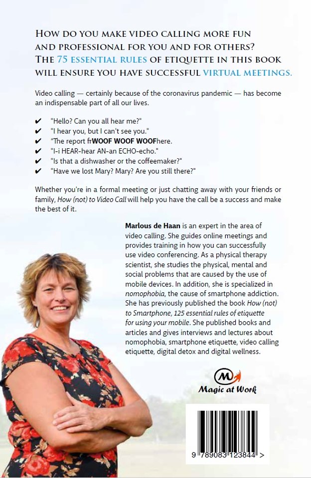 Marlous de Haan is an expert in the area of video calling. She guides online meetings and provides training in how you can successfully use video conferencing. As a physical therapy scientist, she studies the physical, mental and social problems that are caused by the use of mobile devices. In addition, she is specialized in nomophobia, the cause of smartphone addiction. She has previously published the book How (not) to Smartphone, 125 essential rules of etiquette for using your mobile. She published books and articles and gives interviews and lectures about nomophobia, smartphone etiquette, video calling etiquette, digital detox and digital wellness.