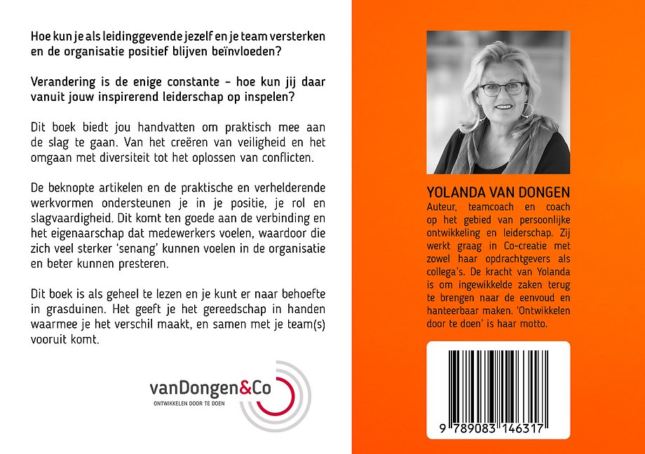 Yolanda van Dongen (1964) is teamcoach en coach persoonlijke ontwikkeling en werkt sinds 2000 vanuit haar bureau Van Dongen & Co. Zij is geboren in Afrika en heeft in verschillende landen en continenten gewoond. Deze achtergrond heeft veel invloed gehad op de keuzes die zij in haar leven en loopbaan heeft gemaakt. De diversiteit aan mensen met uiteenlopende achtergronden is een grote inspiratiebron. Waarom doen mensen wat ze doen? Of doen ze dingen juist niet? Hoe nemen ze regie om zelf een wending aan hun leven te geven? Haar drive is om mensen en organisaties in beweging te houden of te krijgen en hun effectiviteit te verhogen. Complexe zaken vereenvoudigen, toegankelijk en toepasbaar maken is haar kracht.