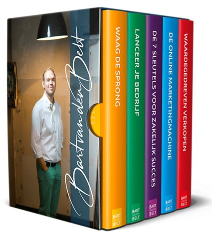Deze exclusieve Business Boekenbox omvat vijf gebonden uitgaven van de boeken van Bart van den Belt. * Waardegedreven verkopen Dit boek is voor iedereen die wil bijdragen aan een waardegedreven economie. Waardegedreven verkopen helpt je om op een compleet andere manier naar je rol als verkoper te kijken en maakt je los van de overtuiging dat verkopen niet leuk is. Daarnaast krijg je een concrete verkoopmethodiek waarmee je moeiteloos leert verkopen. * De Online Marketingmachine Met dit boek wil ik een praktisch totaaloverzicht aanbieden waarmee jij de complexe online marketingpuzzel begrijpt én zelf kunt oplossen. Als je de laatste bladzij gelezen hebt, kun jij zelf aan de slag om betere resultaten te bereiken met je bedrijf. Je zult daarvoor heel wat werk moeten verzetten, maar ik beloof je dat al dat werk de moeite waard zal zijn. * Lanceer je bedrijf Dit boek helpt je om je bedrijf succesvol te lanceren. Voor starters betekent het een goede basis en voor gevorderde ondernemers helpt het om hun bedrijf (en zichzelf) opnieuw uit te vinden. Een must-read voor iedere zzp’er of zelfstandig professional die zakelijk succes wil bereiken. * Waag de sprong Veel mensen hebben dromen of ambities die ze niet realiseren, omdat ze tegen belemmeringen aanlopen. Dromen zijn mooi, maar er moet wel brood op de plank komen en de hypotheek moet ook betaald worden. En daarbij, waar moet je überhaupt beginnen? Wat is de eerste stap en hoe pak ik dat aan? Zijn dit vragen waar jij mee worstelt? Dan is dit boek voor jou! * De 7 sleutels voor zakelijk succes De 7 sleutels voor zakelijk succes helpt je bij de groei van je bedrijf, of je nu net gestart bent of al een tijdje onderweg. Hierin krijg je zeven sleutels waarmee je de juiste sloten opent op weg naar zakelijk succes. Dat wil niet zeggen dit boek een simpel 7-stappenplan is om in no-time financieel vrij te worden of je bedrijf zelfstandig draaiend te krijgen, maar ik hoop dat dit boek je inspireert om een bedrijf op te bouwen waaruit jij voldoening haalt en waarmee je tegelijkertijd impact maakt op je markt.