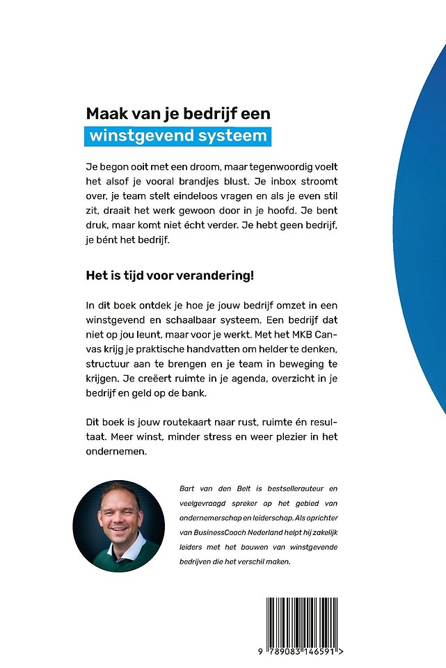 In dit boek ontdek je hoe je jouw bedrijf omzet in een winstgevend en schaalbaar systeem. Een bedrijf dat niet op jou leunt, maar voor je werkt. Met het MKB Canvas krijg je praktische handvatten om helder te denken, structuur aan te brengen en je team in beweging te krijgen. Je creëert ruimte in je agenda, overzicht in je bedrijf en geld op de bank.