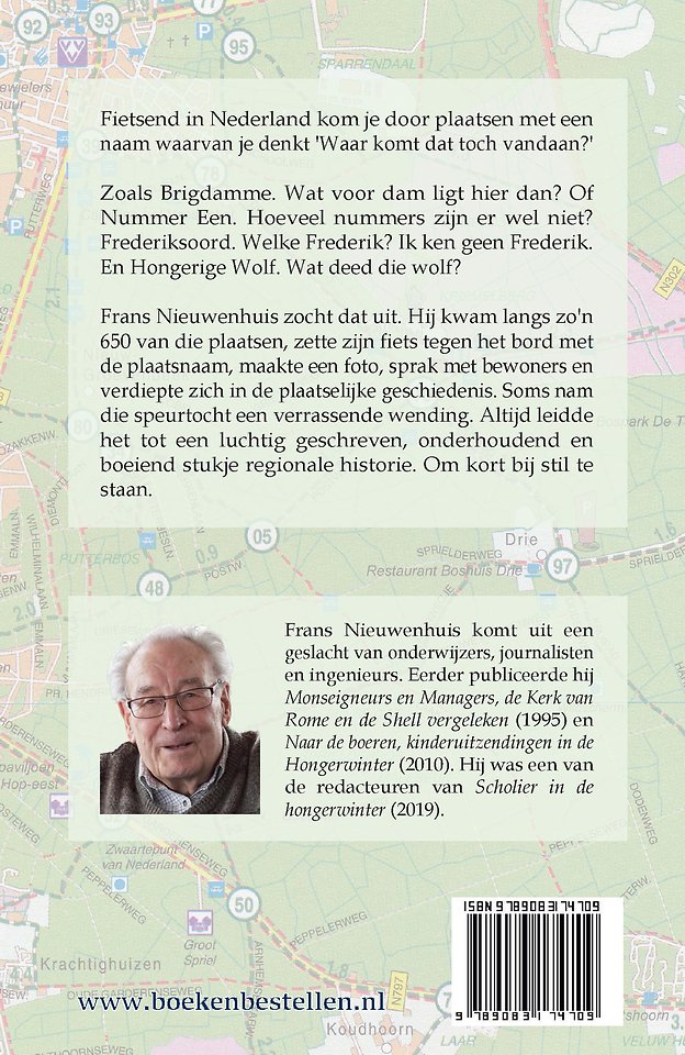 Frans Nieuwenhuis zocht dat uit. Hij kwam langs zo'n 650 van die plaatsen, zette zijn fiets tegen het bord met de plaatsnaam, maakte een foto, sprak met bewoners en verdiepte zich in de plaatselijke geschiedenis. Soms nam die speurtocht een verrassende wending. Altijd leidde het tot een luchtig geschreven, onderhoudend en boeiend stukje regionale historie. Om kort bij stil te staan.