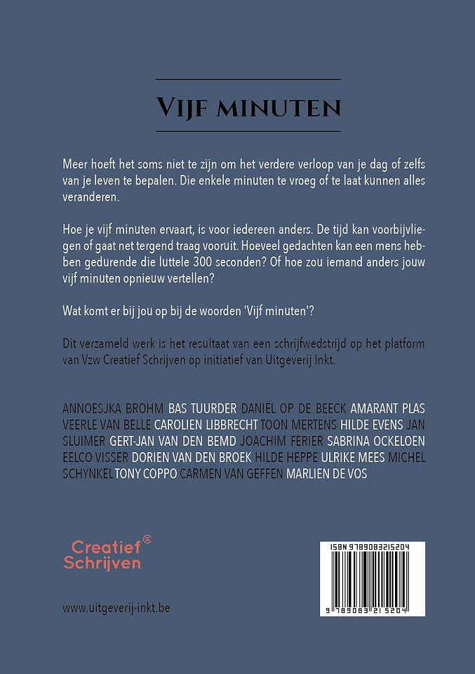 Dit verzameld werk is het resultaat van een schrijfwedstrijd op het platform van Vzw Creatief Schrijven op initiatief van Uitgeverij Inkt.