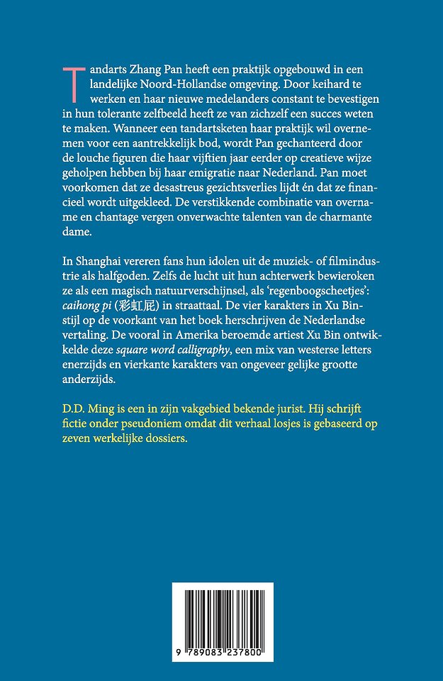 In China vereren fans hun idolen uit de muziek- of filmindustrie als halfgoden. Zelfs de lucht uit hun achterwerk bewieroken ze als een magisch natuurverschijnsel, als ‘regenboogscheetjes’: caihong pi (彩虹屁) in straattaal. De vier karakters in Xu Bin-stijl op de voorkant van het boek herschrijven de Nederlandse vertaling. De vooral in Amerika beroemde artiest Xu Bin ontwikkelde deze square word calligraphy, een mix van westerse letters enerzijds en vierkante karakters van ongeveer gelijke grootte anderzijds.