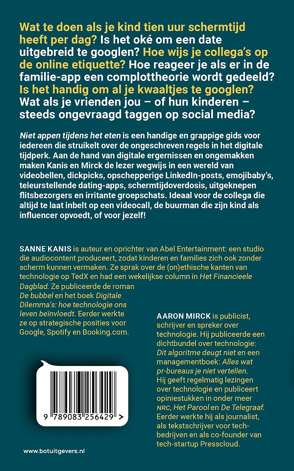 'Niet appen tijdens het eten' is een handige en grappige gids voor iedereen die struikelt over de ongeschreven regels in het digitale tijdperk. Aan de hand van digitale ergernissen en ongemakken maken Kanis en Mirck de lezer wegwijs in een wereld van videobellen, dickpicks, opschepperige LinkedIn-posts, emojibaby’s, teleurstellende dating-apps, schermtijdoverdosis, uitgeknepen flitsbezorgers en irritante groepschats.