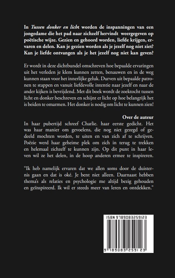 In “Tussen donker en licht” worden de inspanningen van een jongedame die het pad naar zichzelf hervindt weergegeven op poëtische wijze. Gezien en gehoord worden, liefde krijgen, ervaren en delen. Kan je gezien worden als je jezelf nog niet ziet? Kan je liefde ontvangen als je het jezelf nog niet kan geven?