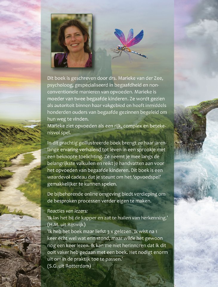 In dit prachtig geïllustreerde boek brengt ze haar jarenlange ervaring verhalend tot leven in een sprookje met een beknopte toelichting. Ze neemt je mee langs de belangrijkste valkuilen en reikt je handvatten aan voor het opvoeden van begaafde kinderen. Dit boek is een waardevol cadeau dat je steunt om het ‘opvoedspel’ gemakkelijker te kunnen spelen.