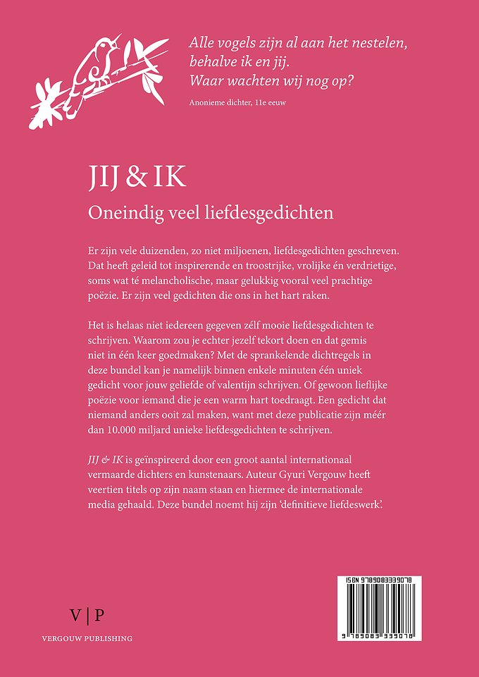 JIJ & IK is geïnspireerd door een groot aantal internationaal vermaarde dichters en kunstenaars. Auteur Gyuri Vergouw heeft veertien titels op zijn naam staan en hiermee de internationale media gehaald. Deze bundel noemt hij zijn ‘definitieve liefdeswerk’.