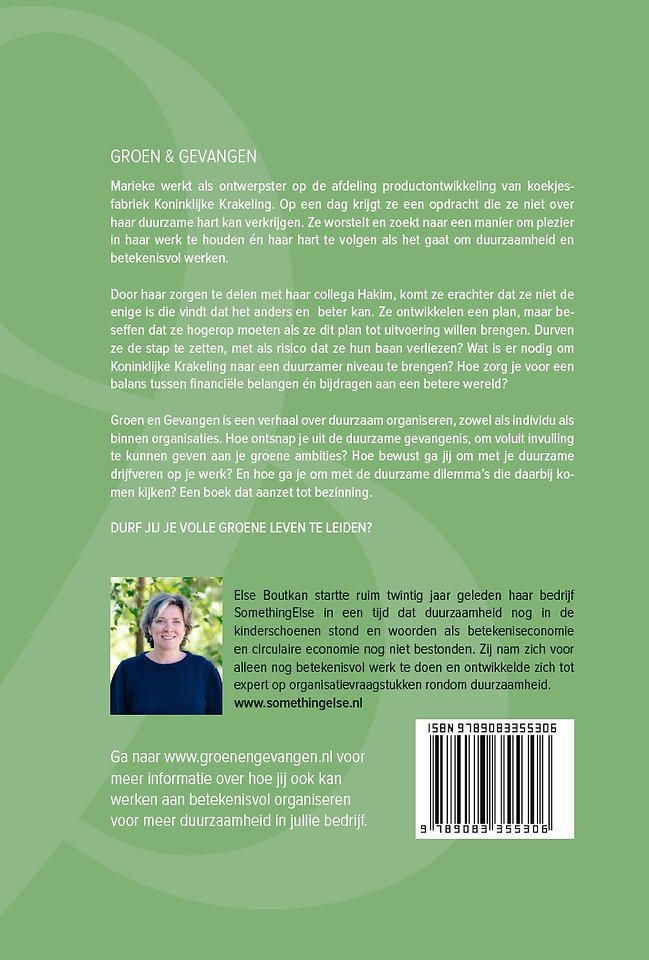 'Groen en Gevangen' is een verhaal over duurzaam organiseren, zowel als individu als binnen organisaties. Hoe ontsnap je uit de duurzame gevangenis, om voluit invulling te kunnen geven aan je groene ambities? Hoe bewust ga jij om met je duurzame drijfveren op je werk? En hoe ga je om met de duurzame dilemma’s die daarbij komen kijken? Een boek dat aanzet tot bezinning.