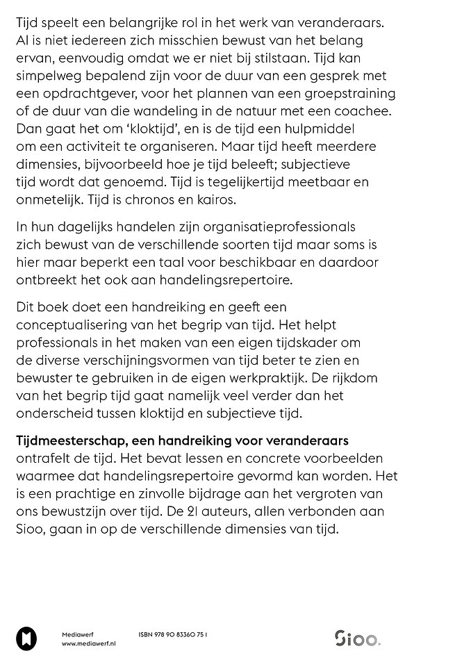 'Tijdmeesterschap, een handreiking voor veranderaars' ontrafelt de tijd. Het bevat lessen en concrete voorbeelden waarmee dat handelingsrepertoire gevormd kan worden. Het is een prachtige en zinvolle bijdrage aan het vergroten van ons bewustzijn over tijd. De 21 auteurs, allen verbonden aan Sioo, gaan in op de verschillende dimensies van tijd.