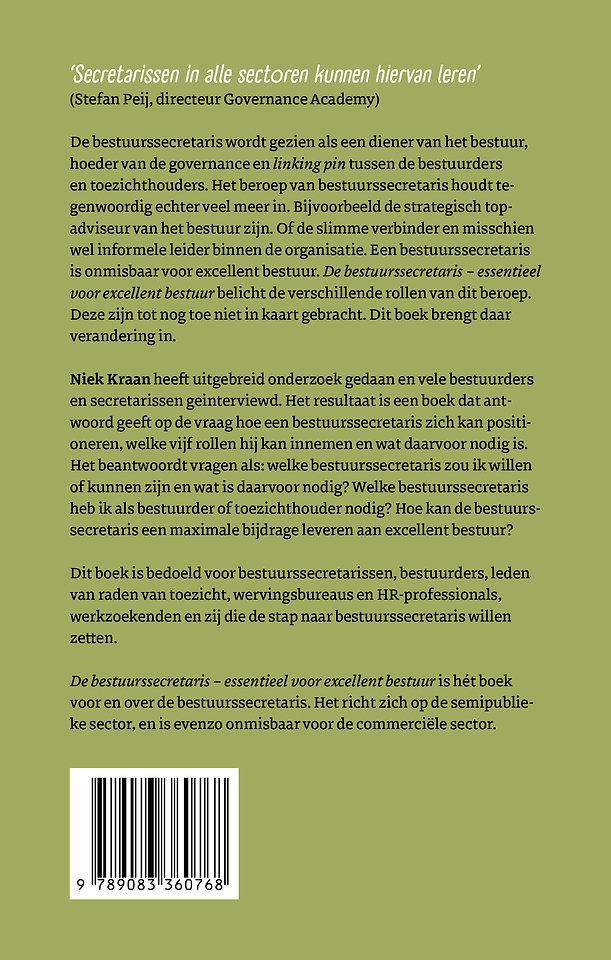 Niek Kraan heeft uitgebreid onderzoek gedaan en vele bestuurders en secretarissen geïnterviewd. Het resultaat is een boek dat antwoord geeft op de vraag hoe een bestuurssecretaris zich kan positioneren, welke vijf rollen hij kan innemen en wat daarvoor nodig is. Het geeft antwoord op vragen als: welke bestuurssecretaris zou ik willen of kunnen zijn en wat is daarvoor nodig? Welke bestuurssecretaris heb ik als bestuurder of toezichthouder nodig? Hoe kan de bestuurssecretaris een maximale bijdrage leveren aan excellent bestuur?