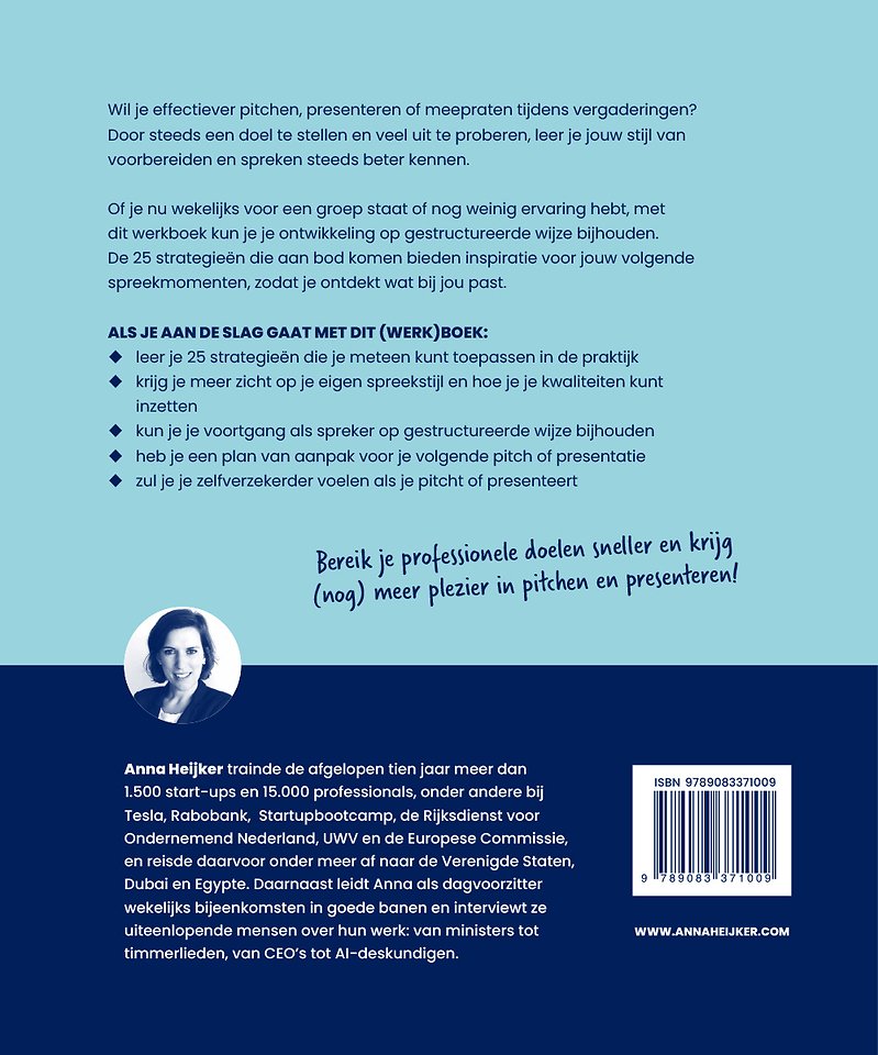 Een heel goed (werk)boek voor iedereen die zichzelf écht verder wil ontwikkelen als spreker. Anna zet je op iedere pagina aan het denken. Ze legt iets uit en stelt daarna vragen, en dat is precies de sleutel tot succes. Het gaat erom dat je jezelf als spreker leert kennen en ontwikkelen. Dan ben je op je best. Anna is jouw deskundige en ervaren gids tijdens die zoektocht. - Roderik van Grieken, oprichter en directeur, Nederlands Debat Instituut