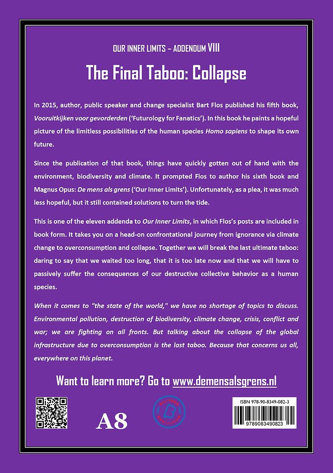 This is one of the eleven addenda to Our Inner Limits, in which Flos’s posts are included in book form. It takes you on a head-on confrontational journey from ignorance via climate change to overconsumption and collapse. Together we will break the last ultimate taboo: daring to say that we waited too long, that it is too late now and that we will have to passively suffer the consequences of our destructive collective behavior as a human species.