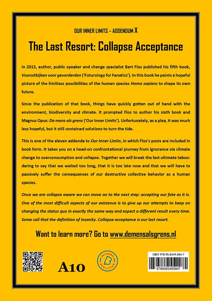 This is one of the eleven addenda to Our Inner Limits, in which Flos’s posts are included in book form. It takes you on a head-on confrontational journey from ignorance via climate change to overconsumption and collapse. Together we will break the last ultimate taboo: daring to say that we waited too long, that it is too late now and that we will have to passively suffer the consequences of our destructive collective behavior as a human species.