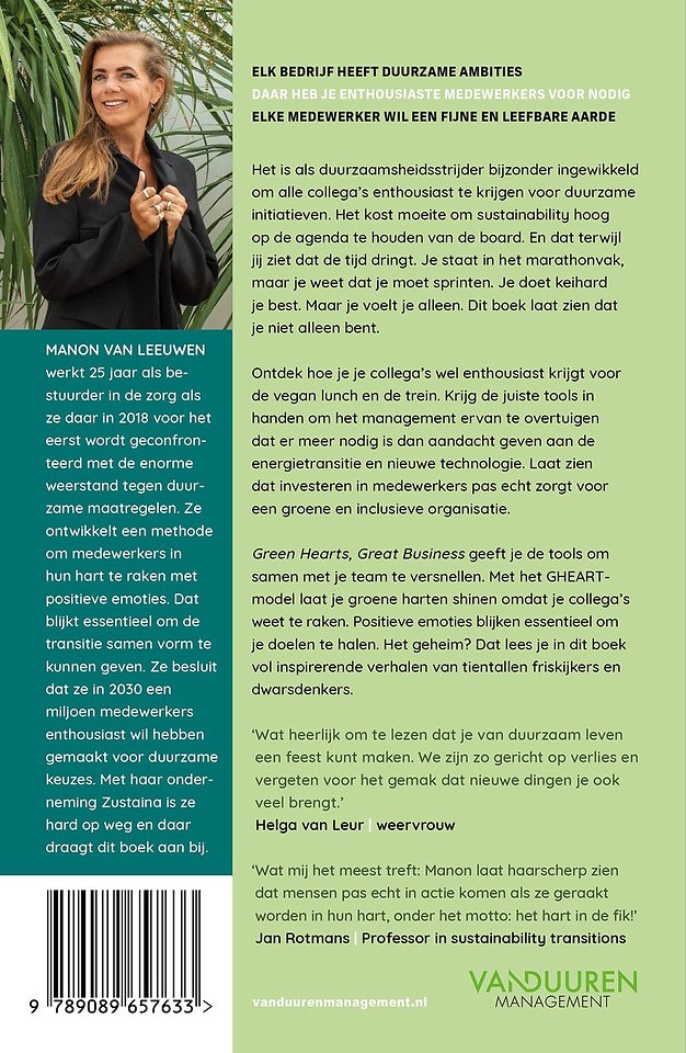 Green Hearts, Great Business geeft je de tools om samen met je team te versnellen. Met het GHEART-model laat je groene harten shinen omdat je collega’s weet te raken. Positieve emoties blijken essentieel om je doelen te halen. Het geheim? Een boek vol inspirerende verhalen van tientallen friskijkers en dwarsdenkers.