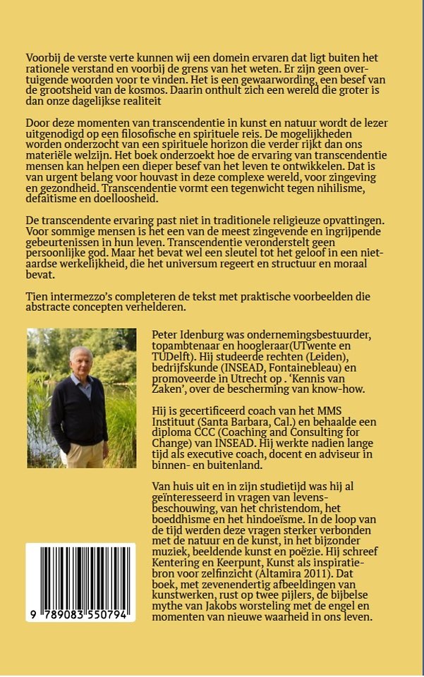 Door deze momenten van transcendentie in kunst en natuur wordt de lezer uitgenodigd op een filosofische en spirituele reis. De mogelijkheden worden onderzocht van een spirituele horizon die verder rijkt dan ons materiële welzijn. Het boek onderzoekt hoe de ervaring van transcendentie mensen kan helpen een dieper besef van het leven te ontwikkelen. Dat is van urgent belang voor houvast in deze complexe wereld, voor zingeving en gezondheid. Transcendentie vormt een tegenwicht tegen nihilisme, defaitisme en doelloosheid.