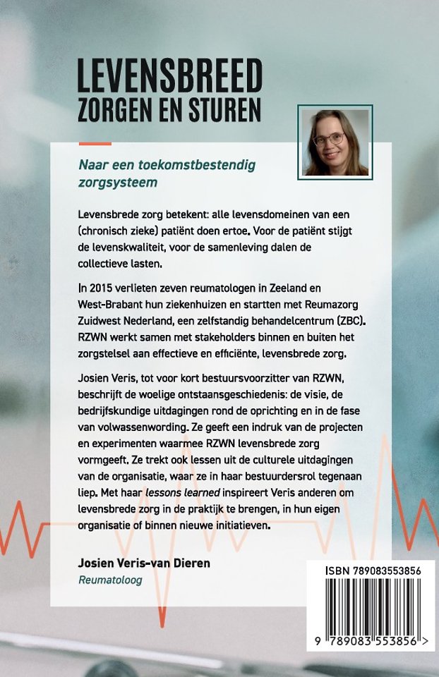 Josien Veris, tot voor kort bestuursvoorzitter van RZWN, beschrijft de woelige ontstaansgeschiedenis: de visie, de bedrijfskundige uitdagingen rond de oprichting en in de fase van volwassenwording. Ze geeft een indruk van de projecten en experimenten waarmee RZWN levensbrede zorg vormgeeft. Ze trekt ook lessen uit de culturele uitdagingen, waar ze in haar bestuurdersrol tegenaan liep. Met haar lessons learned inspireert Veris anderen om levensbrede zorg in de praktijk te brengen, in hun eigen organisatie of binnen nieuwe initiatieven.