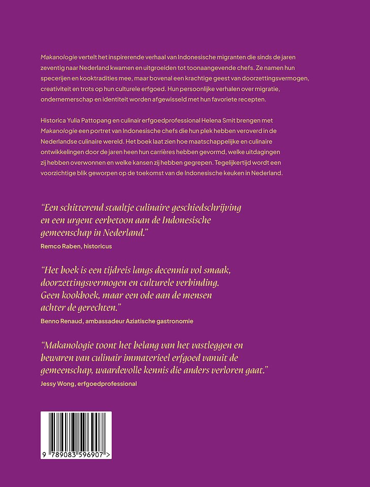 Historica Yulia Pattopang en culinair erfgoedprofessional Helena Smit brengen met 'Makanologie' een portret van Indonesische chefs die hun plek hebben veroverd in de Nederlandse culinaire wereld. Het boek laat zien hoe maatschappelijke en culinaire ontwikkelingen door de jaren heen hun carrières hebben gevormd, welke uitdagingen zij hebben overwonnen en welke kansen zij hebben gegrepen. Tegelijkertijd wordt een voorzichtige blik geworpen op de toekomst van de Indonesische keuken in Nederland.
