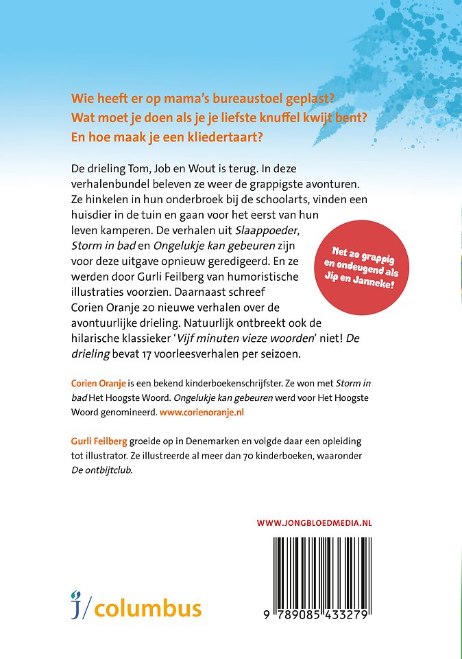 De drieling Tom, Job en Wout is terug. In deze verhalenbundel beleven ze weer de grappigste avonturen. Ze hinkelen in hun onderbroek bij de schoolarts, vinden een huisdier in de tuin en gaan voor het eerst van hun leven kamperen. De verhalen uit Slaappoeder, Storm in bad en Ongelukje kan gebeuren zijn voor deze uitgave opnieuw geredigeerd. En ze werden door Gurli Feilberg van humoristische illustraties voorzien. Daarnaast schreef Corien Oranje 20 nieuwe verhalen over de avontuurlijke drieling. Natuurlijk ontbreekt ook de hilarische klassieker 'Vijf minuten vieze woorden' niet! De drieling bevat 17 voorleesverhalen per seizoen.
