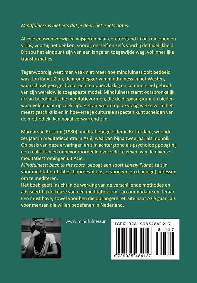 Mindfulness: back to the roots beoogt een soort Lonely Planet te zijn voor meditatieretraites, boordevol tips, ervaringen en (handige) adressen om te mediteren. Het boek geeft inzicht in de werking van de verschillende methodes en adviseert bij de keuze van een meditatievorm, -accommodatie en -leraar. Een must have, zowel voor hen die op langere retraite naar Azië gaan, als