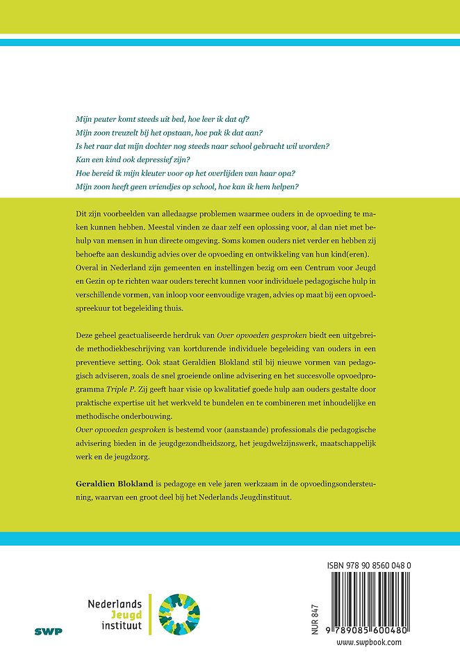 Deze geheel geactualiseerde herdruk van Over opvoeden gesproken biedt een uitgebreide methodiekbeschrijving van kortdurende individuele begeleiding van ouders in een preventieve setting. Ook staat Geraldien Blokland stil bij nieuwe vormen van pedagogisch adviseren, zoals de snel groeiende online advisering en het succesvolle opvoedprogramma Triple P. Zij geeft haar visie op kwalitatief goede hulp aan ouders gestalte door praktische expertise uit het werkveld te bundelen en te combineren met inhoudelijke en methodische onderbouwing.