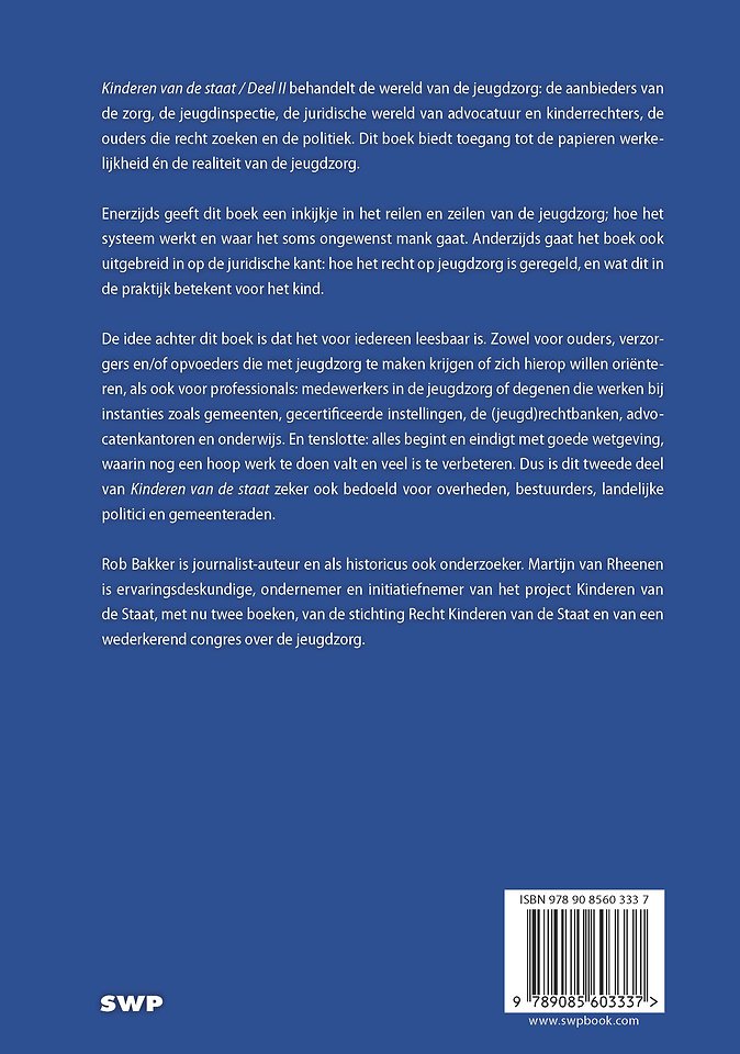 Rob Bakker is journalist-auteur en als historicus ook onderzoeker. Martijn van Rheenen is ervaringsdeskundige, ondernemer en initiatiefnemer van het project Kinderen van de Staat, met nu twee boeken, van de stichting Recht Kinderen van de Staat en van een wederkerend congres over de jeugdzorg.