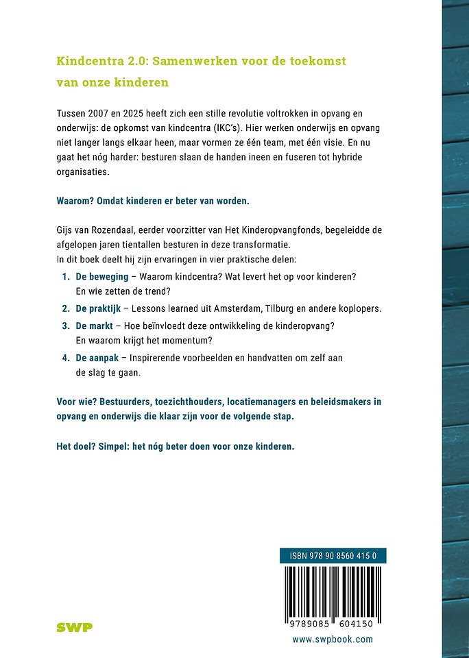 Kindcentra 2.0: Samenwerken voor de toekomst van onze kinderen Tussen 2007 en 2025 heeft zich een stille revolutie voltrokken in opvang en onderwijs: de opkomst van kindcentra (IKC’s). Hier werken onderwijs en opvang niet langer langs elkaar heen, maar vormen ze één team, met één visie. En nu gaat het nóg harder: besturen slaan de handen ineen en fuseren tot hybride organisaties. Waarom? Omdat kinderen er beter van worden. Gijs van Rozendaal (toezichthouder, interim-bestuurder en eerder voorzitter van Het Kinderopvangfonds) begeleidde de afgelopen jaren tientallen besturen in deze transformatie. In dit boek deelt hij zijn ervaringen in vier praktische delen: 1. De beweging – Waarom kindcentra? Wat levert het op voor kinderen? En wie zetten de trend? 2. De praktijk – Lessons learned uit Amsterdam, Tilburg en andere koplopers. 3. De markt – Hoe beïnvloedt deze ontwikkeling de marktwerking? Hoe geven we de beweging meer rugwind? 4. De aanpak – Inspirerende voorbeelden en handvatten om zelf aan de slag te gaan. Voor wie? Bestuurders, toezichthouders, locatiemanagers en beleidsmakers in opvang en onderwijs die klaar zijn voor de volgende stap. Het doel? Simpel: het nóg beter doen voor onze kinderen!