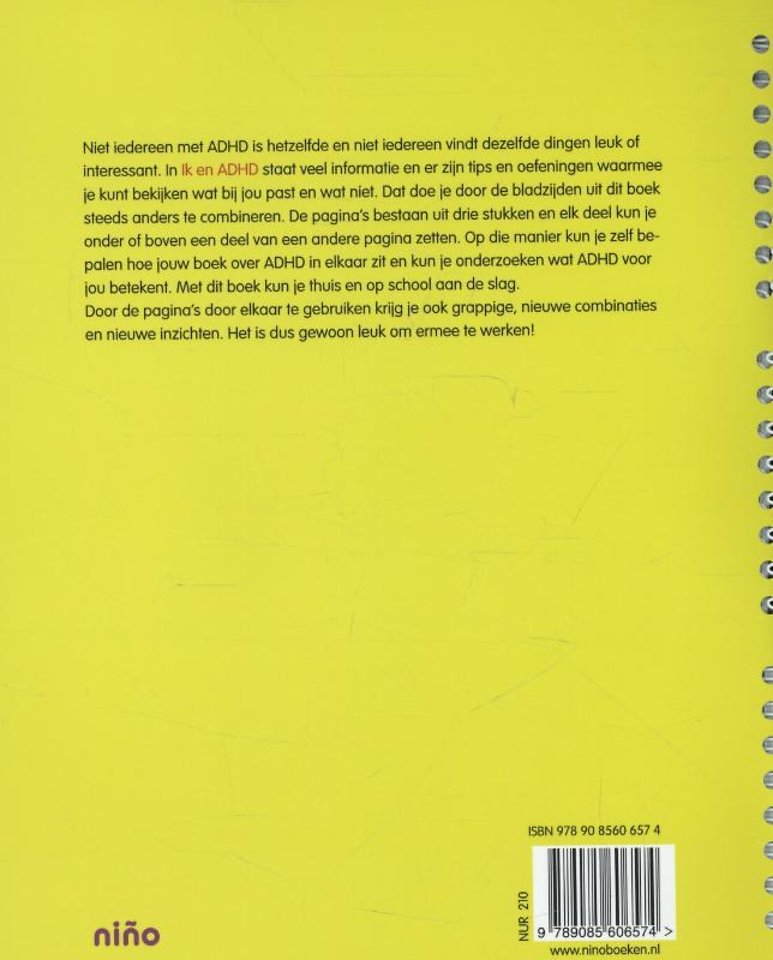 Niet iedereen met ADHD is hetzelfde en niet iedereen vindt dezelfde dingen leuk of interessant . In Ik en ADHD staat veel informatie en er zijn tips en oefeningen waarmee je kunt bekijken wat bij jou past en wat niet. Dat doe je door de bladzijden uit dit boek steeds anders te combineren. De pagina's bestaan uit drie stukken en elk deel kun je onder of boven een deel van een andere pagina zetten. Op die manier kun je zelf bepalen hoe jouw boek over ADHD in elkaar zit en kun je onderzoeken wat ADHD voor jou betekent. Met dit boek kun je thuis en op school aan de slag.