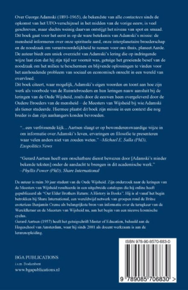 Dit boek citeert, waar mogelijk, Adamski’s eigen woorden en toont aan hoe zijn werk als voorbode van de Ruimtebroeders en hun leringen nauw aansluit bij de leringen van de Oude Wijsheid, zoals door de eeuwen heen overgeleverd door de Oudere Broeders van de mensheid – de Meesters van Wijsheid bij wie Adamski als tiener studeerde. Hiermee plaatst dit boek zijn missie in een context die nog breder is dan zijn aanhangers konden bevroeden.