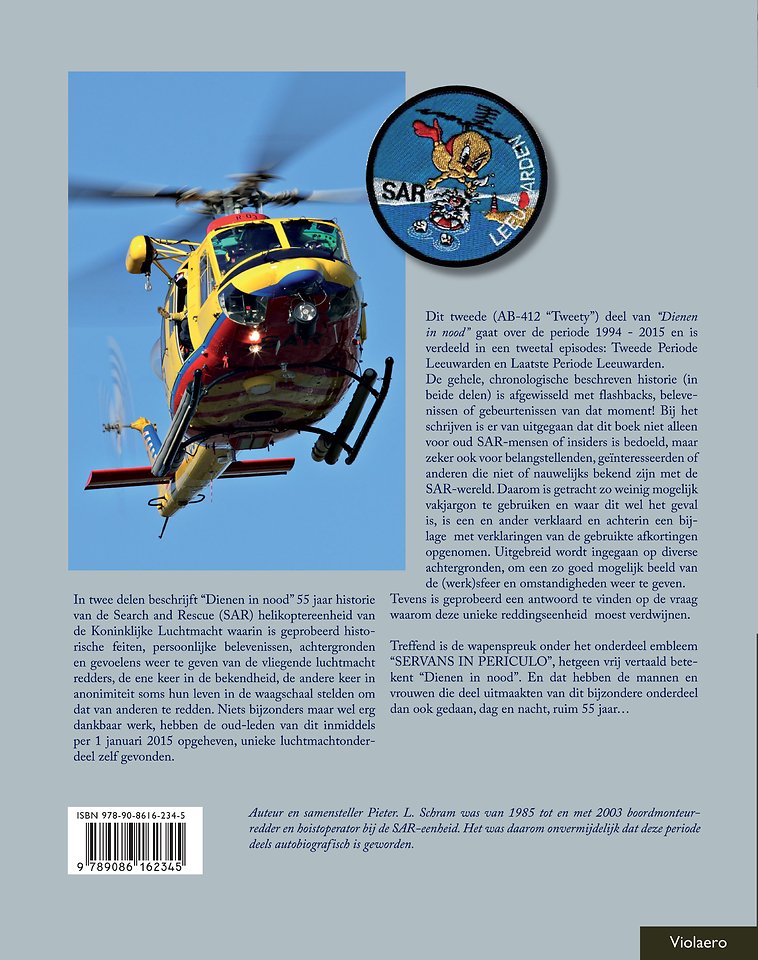 In twee delen beschrijft “Dienen in nood” 55 jaar historie van de Search and Rescue (SAR) helikoptereenheid van de Koninklijke Luchtmacht waarin is geprobeerd historische feiten, persoonlijke belevenissen, achtergronden en gevoelens weer te geven van de vliegende luchtmacht redders, de ene keer in de bekendheid, de andere keer in anonimiteit soms hun leven in de waagschaal stelden om dat van anderen te redden. Niets bijzonders maar wel erg dankbaar werk, hebben de oud-leden van dit inmiddels per 1 januari 2015 opgeheven, unieke luchtmachtonderdeel zelf gevonden.