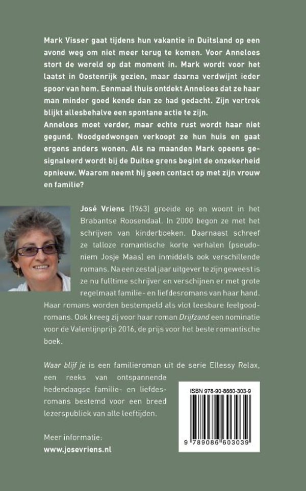 Meer over Jose VriensMark Visser gaat tijdens hun vakantie in Duitsland op een avond weg om niet meer terug te komen. Voor Anneloes stort de wereld op dat moment in. Mark wordt voor het laatst in Oostenrijk gezien, maar daarna verdwijnt ieder spoor van hem. Eenmaal thuis ontdekt Anneloes dat ze haar man minder goed kende dan ze had gedacht. Zijn vertrek blijkt allesbehalve een spontane actie te zijn.