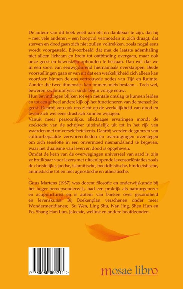 De auteur van dit boek geeft aan blij en dankbaar te zijn, dat hij – met vele anderen – een hoopvol vermoeden in zich draagt, dat sterven en doodgaan zich niet zullen voltrekken, zoals nogal eens wordt voorgesteld. Bijvoorbeeld dat met de laatste ademhaling niet alleen lichaam en brein tot ontbinding overgaan, maar ook onze geest en bewustzijn ophouden te bestaan. Dan wel dat we in een soort van eeuwigdurend hiernamaals overstappen. Beide voorstellingen gaan er van uit dat een werkelijkheid zich alleen kan voordoen binnen de ons vertrouwde noties van Tijd en Ruimte. Zonder die twee dimensies kan immers niets bestaan... Toch wel, beweren kwantumfysici sinds begin vorige eeuw.