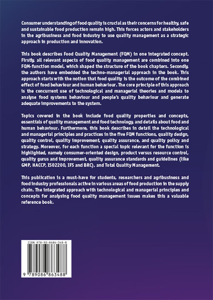 This book describes Food Quality Management (FQM) in one integrated concept. Firstly, all relevant aspects of food quality management are combined into one FQM-function model, which shaped the structure of the book chapters. Secondly, the authors have embedded the techno-managerial approach in the book. This approach starts with the notion that food quality is the outcome of the combined effect of food behaviour and human behaviour. The core principle of this approach is the concurrent use of technological and managerial theories and models to analyse food systems behaviour and people's quality behaviour and generate adequate improvements to the system. Topics covered in the book include food quality properties and concepts, essentials of quality management and food technology, and details about food and human behaviour. Furthermore, this book describes in detail the technological and managerial principles and practices in the five FQM functions, quality design, quality control, quality improvement, quality assurance, and quality policy and strategy.