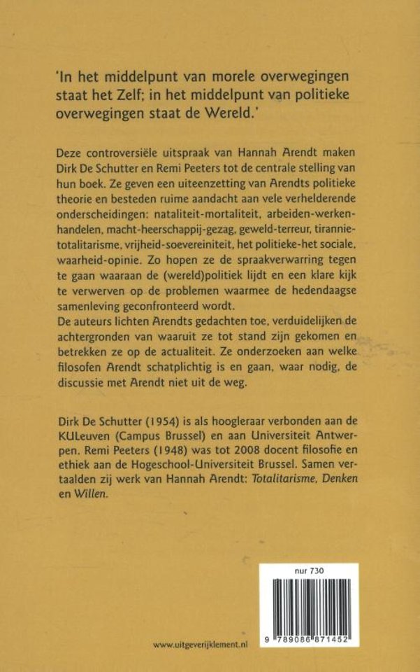 Deze controversiële uitspraak van Hannah Arendt maken Dirk De Schutter en Remi Peeters tot de centrale stelling van hun boek. Ze geven een uiteenzettting van Arendts politieke theorie en besteden ruime aandacht aan vele verhelderende onderscheidingen: nataliteit-mortaliteit, arbeiden-werken-handelen, macht-heerschappij-gezag, geweld-terreur, tirannie-totalitarisme, vrijheid-soevereiniteit, het politieke-het sociale, waarheid-opinie. Zo hopen ze de spraakverwarring tegen te gaan waaraan het (wereld)politiek lijdt en een klare kijk te verwerven op de problemen waarmee de hedendaagse samenleving geconfronteerd wordt.