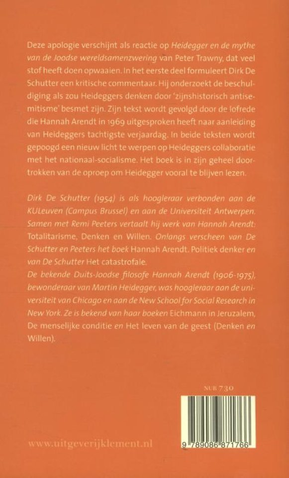 Deze apologie verschijnt als reactie op 'Heidegger en de mythe van de Joodse wereldsamenzwering' van Peter Trawny, dat veel stof heeft doen opwaaien. In het eerste deel formuleert Dirk De Schutter een kritische commentaar. Hij onderzoekt de beschuldiging als zou Heideggers denken door 'zijnshistorisch antisemitisme' besmet zijn. Zijn tekst wordt gevolgd door de lofrede die Hannah Arendt in 1969 uitgesproken heeft naar aanleiding van Heideggers tachtigste verjaardag. In beide teksten wordt gepoogd een nieuw licht te werpen op Heideggers collaboratie met het nationaal-socialisme. Het boek is in zijn geheel doortrokken van de oproep om Heidegger vooral te blijven lezen.