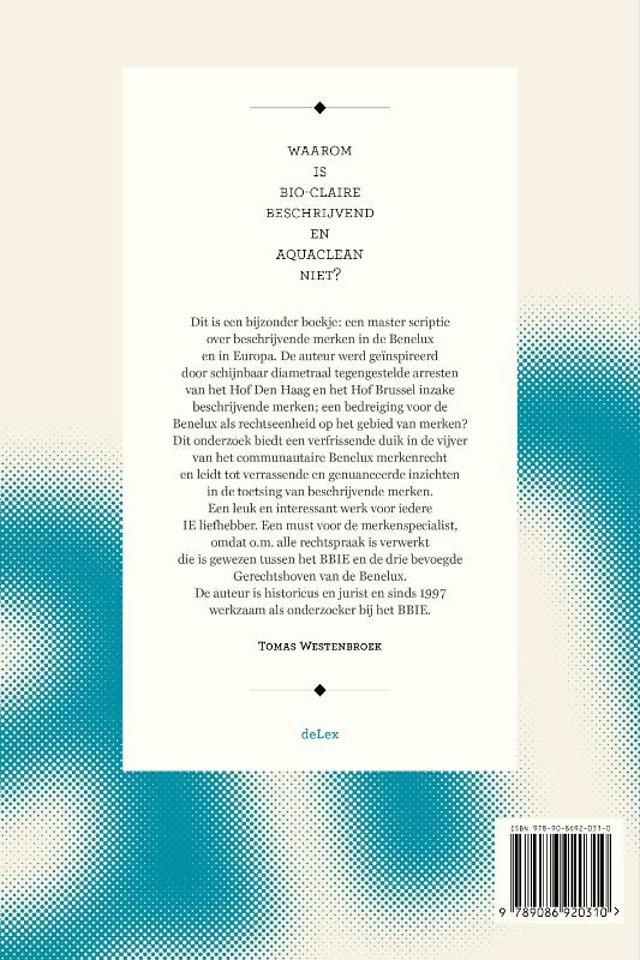 Dit onderzoek biedt een verfrissende duik in de vijver van het communautaire Benelux merkenrecht en leidt tot verrassende en genuanceerde inzichten in de toetsing van beschrijvende merken. Een leuk en interessant werk voor iedere IE liefhebber. Een must voor de merkenspecialist, omdat o.m. alle rechtspraak is verwerkt die is gewezen tussen het BBIE en de drie bevoegde Gerechtshoven van de Benelux. De auteur is historicus en jurist en sinds 1997 werkzaam als onderzoeker bij het BBIE.