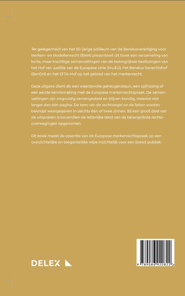 Ter gelegenheid van het 50-jarige jubileum van de Beneluxvereniging voor Merken- en Modellenrecht (BMM) presenteert dit boek een verzameling van korte, maar krachtige samenvattingen van de belangrijkste beslissingen van het Hof van Justitie van de Europese Unie (HvJEU), het Benelux Gerechtshof (BenGH) en het EFTA-Hof op het gebied van het merkenrecht.