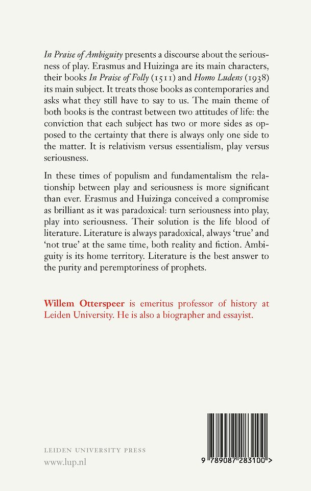 "In Praise of Ambiguity" presents a discourse about the seriousness of play. Erasmus and Huizinga are its main characters, their books In Praise of Folly (1511) and Homo Ludens (1938) its main subject. It treats those books as contemporaries and asks what they still have to say to us. The main theme of both books is the contrast between two attitudes of life: the conviction that each subject has two or more sides as opposed to the certainty that there is always only one side to the matter. It is relativism versus essentialism, play versus seriousness.