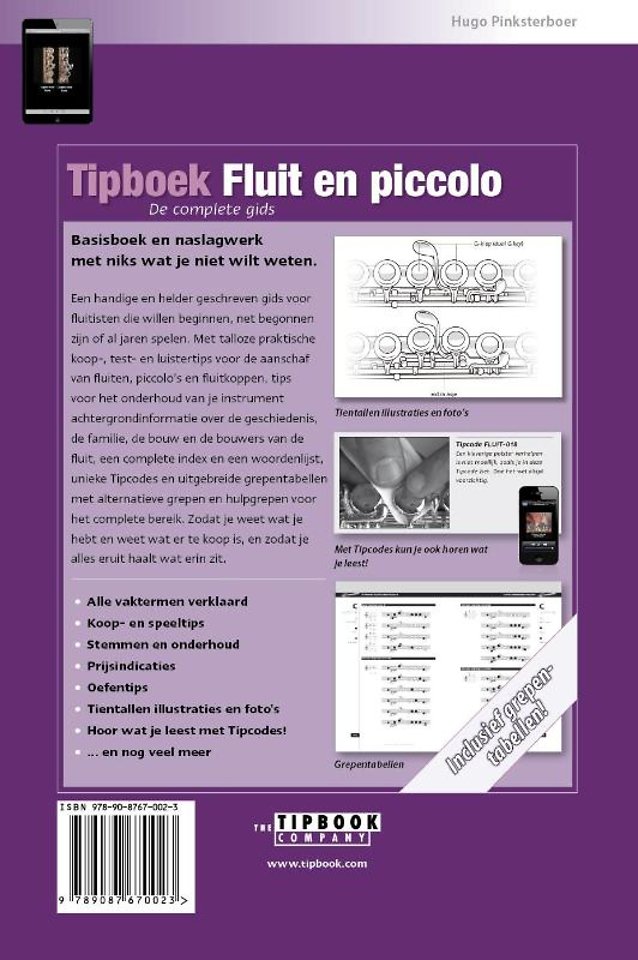 Alles weten over jouw instrument? Tipboek Fluit en piccolo vertelt je het hele verhaal, van aanschaf tot onderhoud. E-mechanieken, open of dichte kleppen, zilveren koppen, buizen en mechanieken, gizmo's, en B-voeten? Het komt allemaal aan bod. Dat maakt het makkelijker om jouw ideale instrument te kopen en om er alles uit te halen wat erin zit. Ook aan stemmen en onderhoud wordt natuurlijk ruim aandacht besteed.