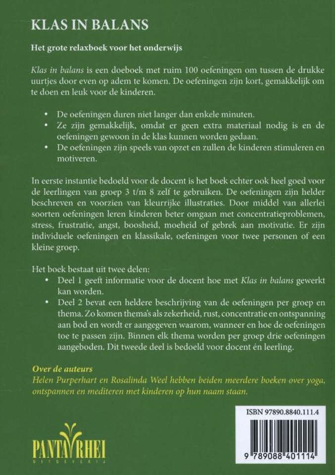 Het uitgangspunt van dit boek is om leerkrachten te inspireren om vanuit een speelse benadering samen met de kinderen tussen de drukke uurtjes door even op adem te komen. Door middel van allerlei soorten oefeningen, zoals ademhalingsoefeningen en stretchoefeningen, leren kinderen beter omgaan met concentratieproblemen, stress, frustratie, angst, boosheid, moeheid, gebrek aan creativiteit en eenzaamheid. De docent kan de progressie van de kinderen goed in de gaten houden door hun gedrag en gevoelens met hen te evalueren aan de hand van speciale feedbackformulieren.