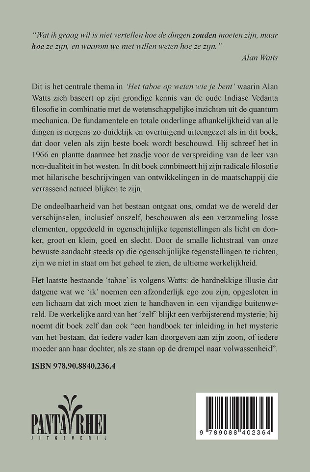 Dit is het centrale thema in ‘Het taboe op weten wie je bent’ waarin Alan Watts zich baseert op zijn grondige kennis van de oude Indiase Vedanta filosofie in combinatie met de wetenschappelijke inzichten uit de quantum mechanica. De fundamentele en totale onderlinge afhankelijkheid van alle dingen is nergens zo duidelijk en overtuigend uiteengezet als in dit boek, dat door velen als zijn beste boek wordt beschouwd. Hij schreef het in 1966 en plantte daarmee het zaadje voor de verspreiding van de leer van non-dualiteit in het westen. In dit boek combineert hij zijn radicale filosofie met hilarische beschrijvingen van ontwikkelingen in de maatschappij die verrassend actueel blijken te zijn.