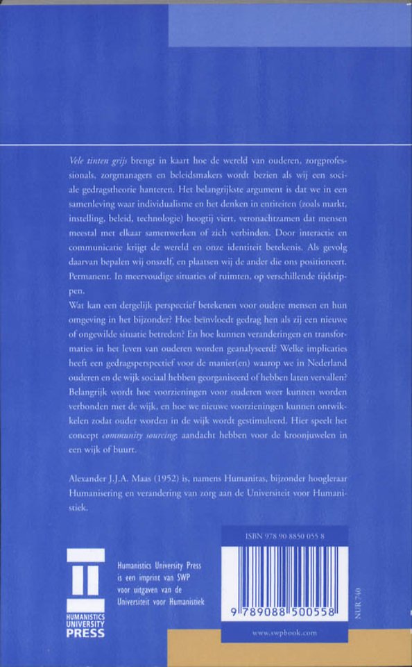 Vele tinten grijs brengt in kaart hoe de wereld van ouderen, zorgprofessionals, zorgmanagers en beleidsmakers wordt bezien als wij een sociale gedragstheorie hanteren. Het belangrijkste argument is dat we in een samenleving waar individualisme en het denken in entiteiten (zoals markt, instelling, beleid, technologie) hoogtij viert, veronachtzamen dat mensen meestal met elkaar samenwerken of zich verbinden. Door interactie en communicatie krijgt de wereld en onze identiteit betekenis. Als gevolg daarvan bepalen wij onszelf, en plaatsen wij de ander die ons positioneert. Permanent. In meervoudige situaties of ruimten, op verschillende tijdstippen.