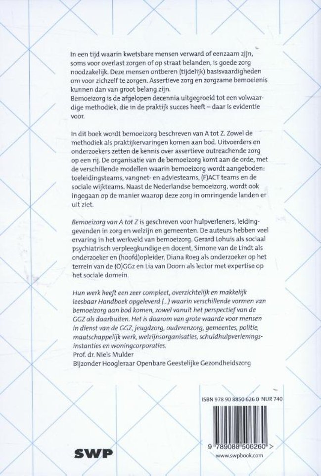 Bemoeizorg van A tot Z is geschreven voor hulpverleners, leidinggevenden in zorg en welzijn en gemeenten. De auteurs hebben veel ervaring in het werkveld van bemoeizorg. Gerard Lohuis als sociaal psychiatrisch verpleegkundige en docent, Simone van de Lindt als onderzoeker en opleider en Diana Roeg als onderzoeker op het terrein van de (O)GGz. Lia van Doorn als lector met expertise op het sociale domein.