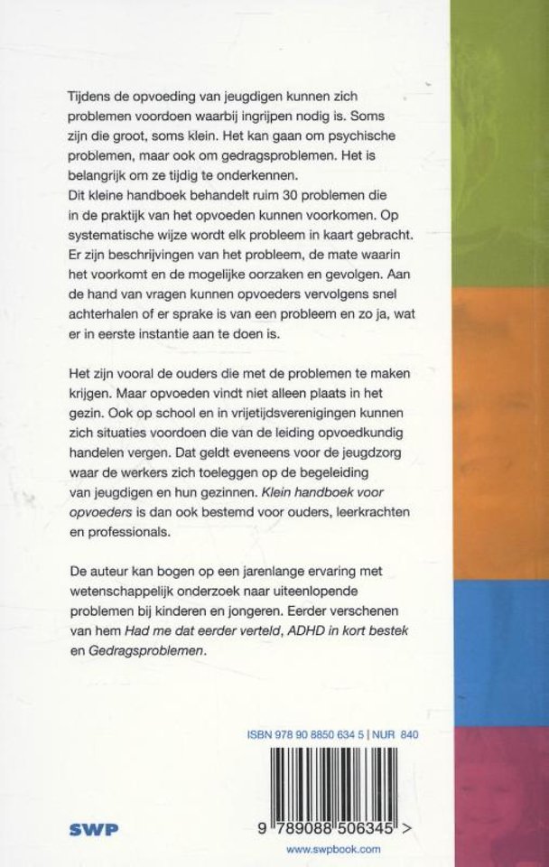 Het zijn vooral de ouders die met de problemen te maken krijgen. Maar opvoeden vindt niet alleen plaats in het gezin. Ook op school en in vrijetijdsverenigingen kunnen zich situaties voordoen die van de leiding opvoedkundig handelen vergen. Dat geldt eveneens voor de jeugdzorg waar de werkers zich toeleggen op de begeleiding van jeugdigen en hun gezinnen. Klein handboek voor opvoeders is dan ook bestemd voor ouders, leerkrachten en professionals.