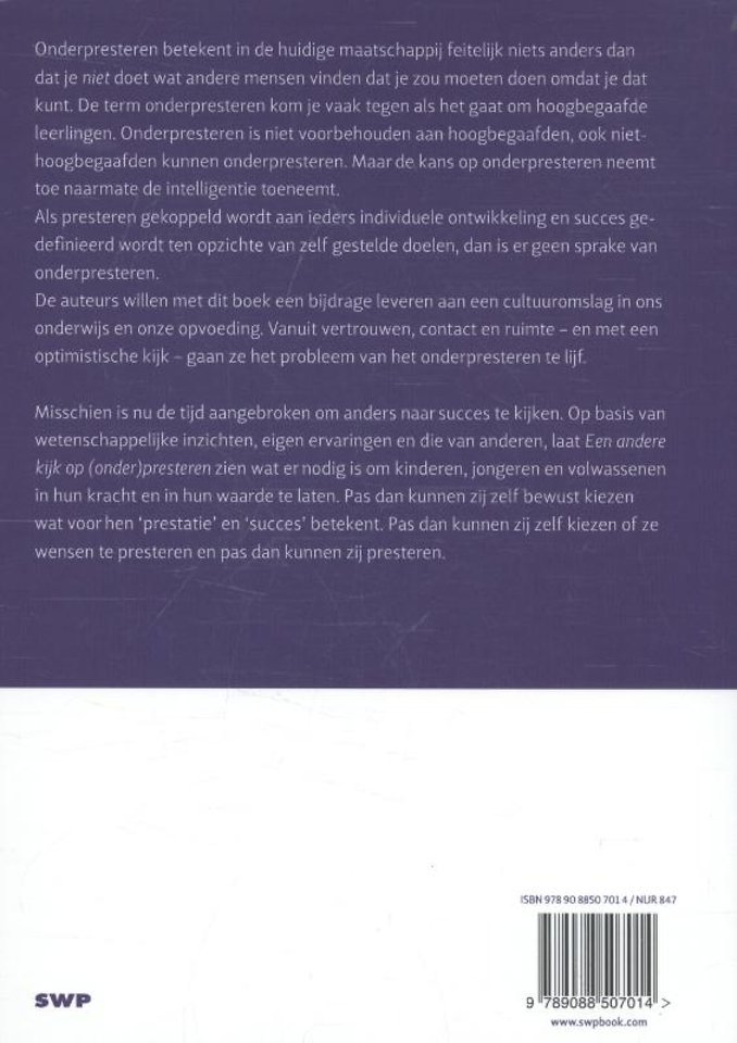 De auteurs willen met dit boek een bijdrage leveren aan een cultuuromslag in ons onderwijs en onze opvoeding. Vanuit vertrouwen, contact en ruimte en met een optimistische kijk gaan ze het probleem van het onderpresteren te lijf. Misschien is nu de tijd aangebroken om succes anders te gaan bekijken. Op basis van wetenschappelijke inzichten, eigen en andermans ervaringen tonen de auteurs wat er nodig is om kinderen, jongeren en volwassenen in hun kracht en in hun waarde te laten. Pas dan kunnen zij zelf bewust kiezen wat voor hun 'prestatie' en 'succes' inhoudt. Pas dan kunnen zij zelf kiezen of zij wensen te presteren. Pas dan kunnen zij presteren.