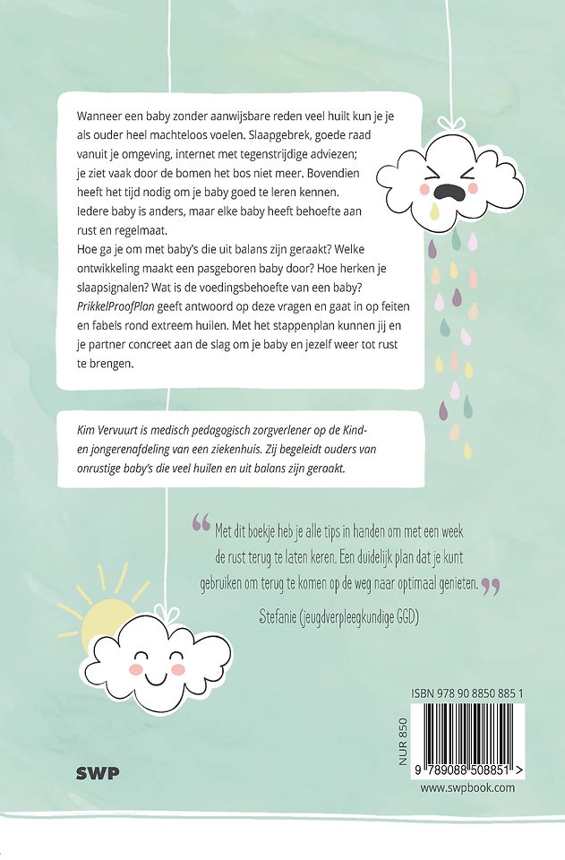 Iedere baby is natuurlijk anders, maar iedere baby heeft behoefte aan rust en regelmaat. Hoe je als ouder weer op het spoor van het prikkelarme, rustgevende traject kunt komen staat helder en stapsgewijs beschreven in dit PrikkelProofPlan. Aan de hand van casussen geeft Kim Vervuurt op geruststellende toon heldere adviezen over hoe om te gaan met baby’s die uit balans zijn. Ze geeft informatie over de ontwikkeling die de pasgeboren (huil)baby's nog moet doormaken, gaat in op feiten en fabels rond extreem huilen, geeft aan wat slaapsignalen zijn en legt de voedingsbehoefte van de baby uit. Met het stappenplan kunnen ouders tenslotte duidelijk aan de slag om hun baby en zichzelf weer tot rust te brengen.