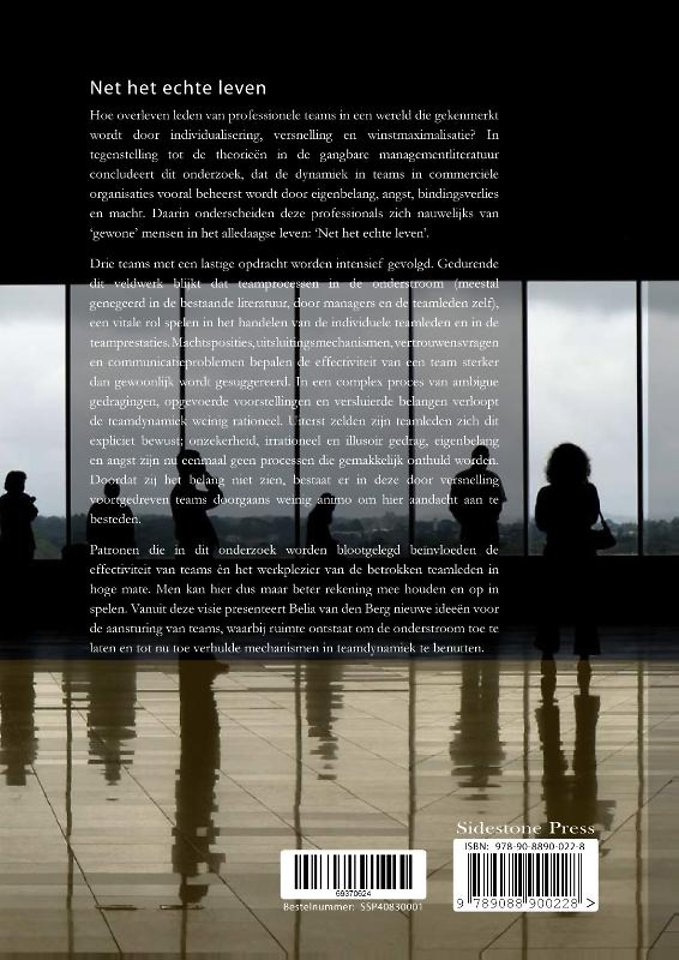 Meer over Belia van den BergHoe overleven leden van professionele teams in een wereld die gekenmerkt wordt door individualisering, versnelling en winstmaximalisatie? In tegenstelling tot de theorieën in de gangbare managementliteratuur concludeert dit onderzoek, dat de dynamiek in teams in commerciële organisaties vooral beheerst wordt door eigenbelang, angst, bindingsverlies en macht. Daarin onderscheiden deze professionals zich nauwelijks van 'gewone' mensen in het alledaagse leven: 'Net het echte leven'.