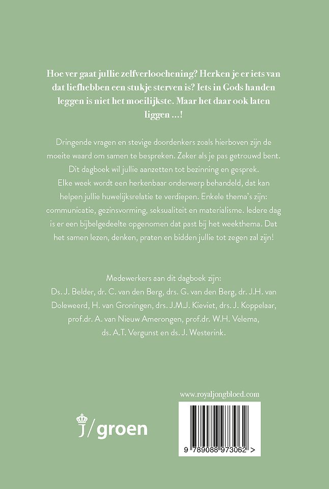 Dit dagboek is allereerst bedoeld voor mannen en vrouwen van wie de trouwdag nog niet zo ver achter hen ligt. Opzet, thematiek, stijl en inhoud zijn afgestemd op deze doelgroep. Uitgangspunt is verdieping te mogen aanbrengen in denken, huwelijks- en gezinsleven. Elf auteurs uit vier kerkverbanden zetten hun schouders onder dit streven. Het resultaat mag er zijn: pakkende, inspirerende en praktische bijbeloverdenkingen, en verdiepende vragen die aanzetten tot bezinning en gesprek. De thema's zijn herkenbaar voor lezers aan het begin van hun huwelijksweg. Al met al een waardevol dagboek om zelf aan te schaffen of om cadeau te doen.