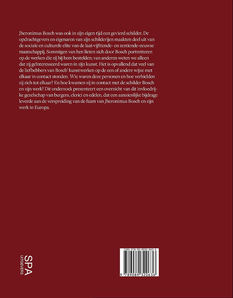 Jheronimus Bosch was ook in zijn eigen tijd een gevierd schilder. De opdrachtgevers en eigenaren van zijn schilderijen maakten deel uit van de sociale en culturele elite van de laat-vijftiende- en zestiende-eeuwse maatschappij. Sommigen van hen lieten zich door Bosch portretteren op de werken die zij bij hem bestelden; van anderen weten we alleen dat zij geïnteresseerd waren in zijn kunst. Het is opvallend dat veel van de liefhebbers van Bosch’ kunstwerken op de een of andere wijze met elkaar in contact stonden. Wie waren deze personen en hoe verhielden zij zich tot elkaar? En hoe kwamen zij in contact met de schilder Bosch en zijn werk? Dit onderzoek presenteert een overzicht van dit invloedrijke gezelschap van burgers, clerici en edelen, dat een aanzienlijke bijdrage leverde aan de verspreiding van de faam van Jheronimus Bosch en zijn werk in Europa.