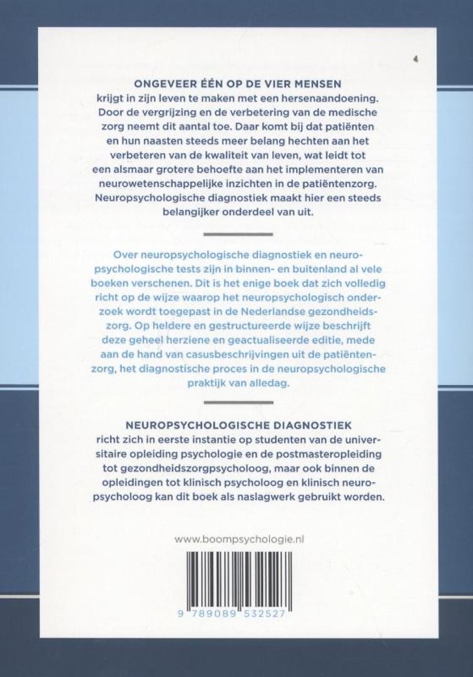 Neuropsychologische diagnostiek is een zoektocht naar verklaringen voor cognitieve of emotionele klachten en stoornissen. Die verklaringen worden vooral gezocht in de hersenen, maar er is ook oog voor psychologische, psychiatrische, somatische en andere, meer alledaagse invloeden. In deze volledig herziene editie is, naast de noodzakelijke actualisatie, de structuur van het boek verhelderd. Het geheel is verlevendigd door de toevoeging van casusbeschrijvingen vanuit de patiëntenzorg.