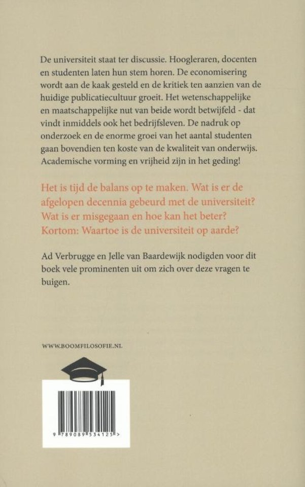 De universiteit is in de achterliggende decennia ingrijpend veranderd: er zijn veel meer studenten dan in het verleden, wetenschap is internationaler en specialistischer geworden, onderwijs lijkt minder belangrijk te zijn dan onderzoek en de competitie om geld is groot. Inmiddels zwelt ook de kritiek aan. Volgens sommigen is de universiteit een koekjesfabriek geworden! Kleine studies verdwijnen als gevolg van een eenzijdige economische rationaliteit. Het denken in aantallen voert de boventoon, de massa en conformisme regeren. De kwaliteit van het onderwijs laat in veel gevallen te wensen over. Academische vorming en taalbeheersing schieten tekort, soms zelfs bij docenten. Bij veel studenten ontbreekt het aan een academische grondhouding. Docenten en onderzoekers zijn onder een publicatieregime geplaatst met perverse prikkels die fraude en verwatering van onderzoek in de hand werken. Het gelddenken en het bureaucratisch management vieren hoogtij. Het is daarom tijd de balans op te maken: wat hebben deze veranderingen ons gebracht? Wat is er gebeurd met de academische vorming en vrijheid? Wat is er mis en wat moet er verbeterd worden? Wat is de plaats van de universiteit in onze samenleving? Wat is haar lokale taak, wat is haar verantwoordelijkheid voor het onderwijs en de publieke ruimte? Het wordt hoog tijd daarover kritisch na te denken!